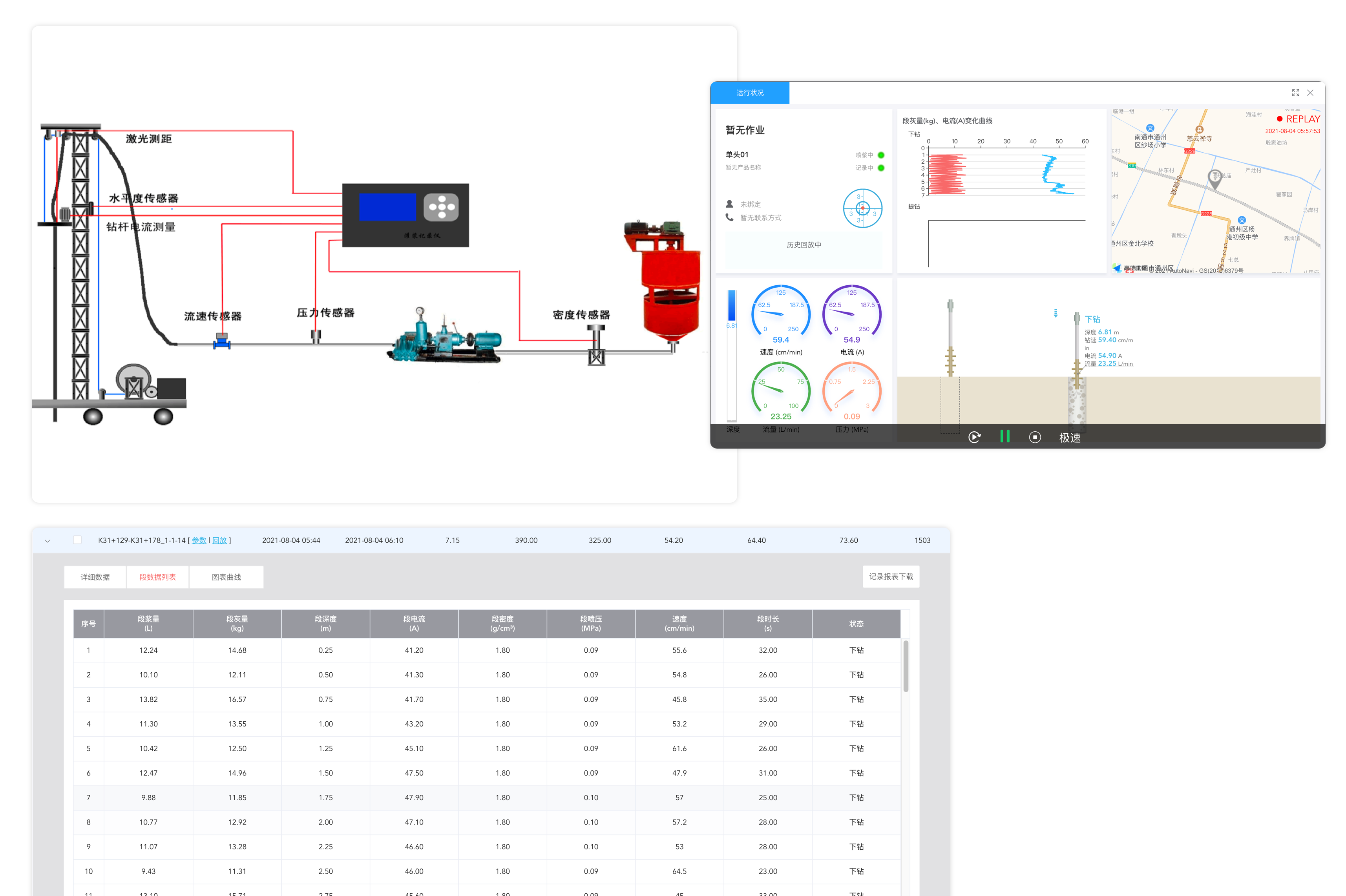 利用高精度定位,物聯(lián)網(wǎng)傳感器等技術(shù),在施工過程中實(shí)時(shí)采集鉆樁深度、鉆樁速度、鉆桿電流、傾斜度、水泥漿流量、材料